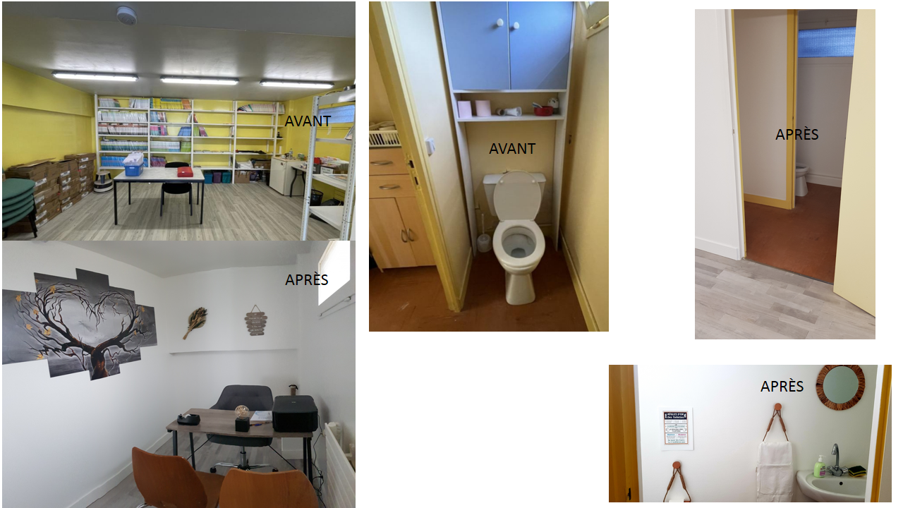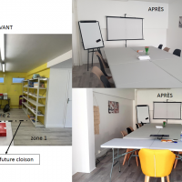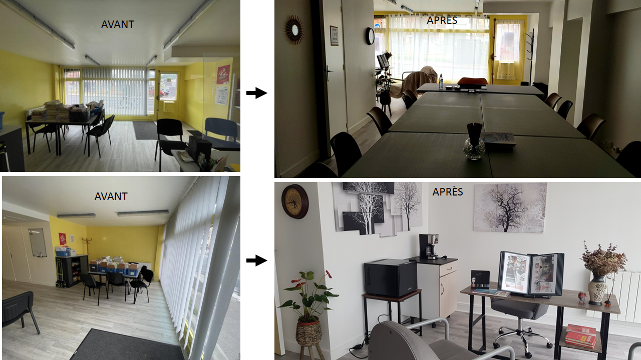 Une salle de formation complètement transformée. Plus de peinture jaune et écaillée, à la place, peinture blanche sauf la devanture. Plus de lino déchiré et usé : à la place, parquet flottant. Une cloison sépare l'immense pièce pour faire place à un petit bureau qui ferme à clés. Un vrai coin accueil est mis en place.